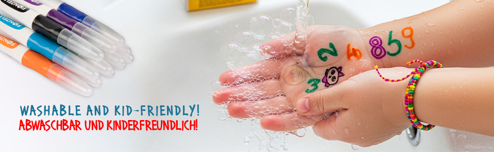 Let creativity flow with the 12 Washable Color Markers for Kids! Each marker features brilliant, vivid, water-based ink that’s easy to wash off hands and most fabrics, making them perfect for children’s art activities.