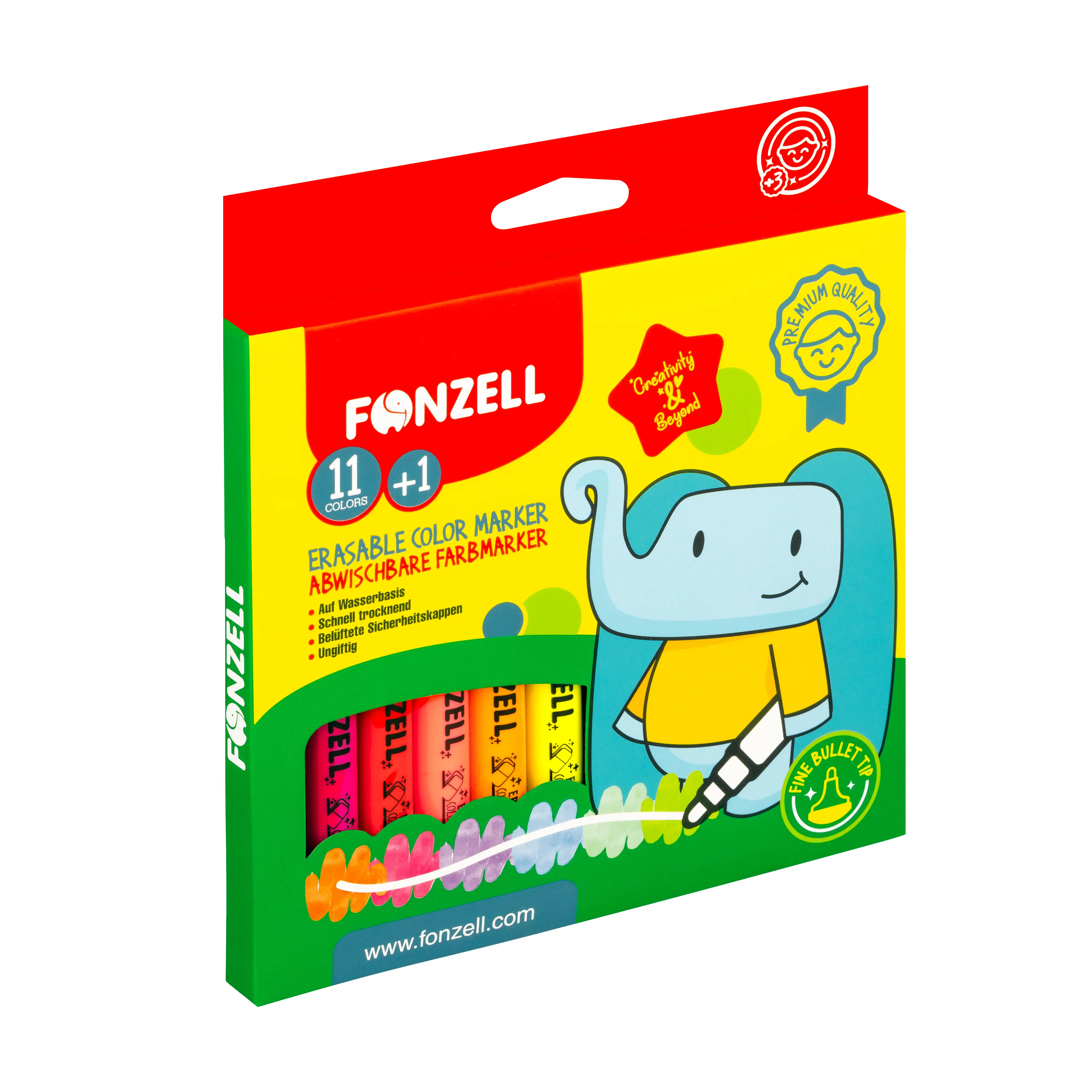 Fonzell Erasable Color Markers are designed with water-based ink and feature a fine bullet tip, making them perfect for homework, journaling, note-taking, and more. These markers are equipped with a special feature: one of the markers in the set has an eraser tip that allows you to magically erase the color with white ink. This makes them a great choice for kids and adults who need to make corrections while working on creative or academic tasks. Available in a set of 12 (11 colors + 1 eraser marker), these markers offer both vibrant color and the convenience of easy erasing.